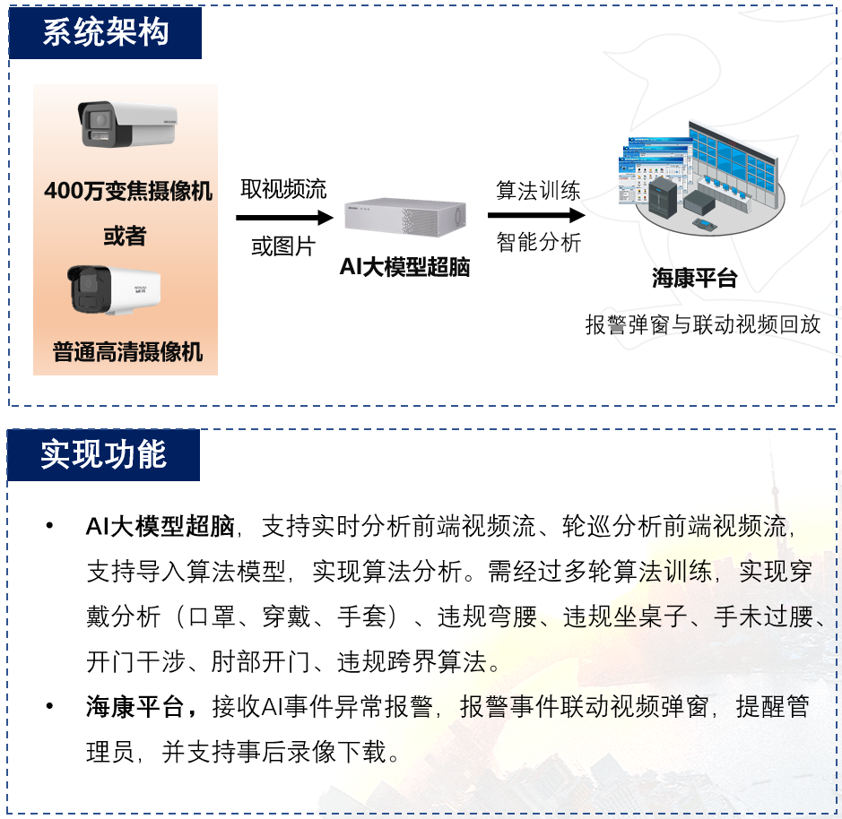 AI 大模型超脑作为核心分析单元,支持实时分析、轮巡分析前端视频流,导入定制算法模型(涵盖穿戴分析、违规行为检测等),经过多轮训练优化算法精度;