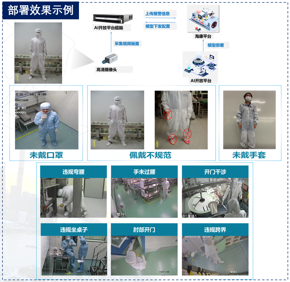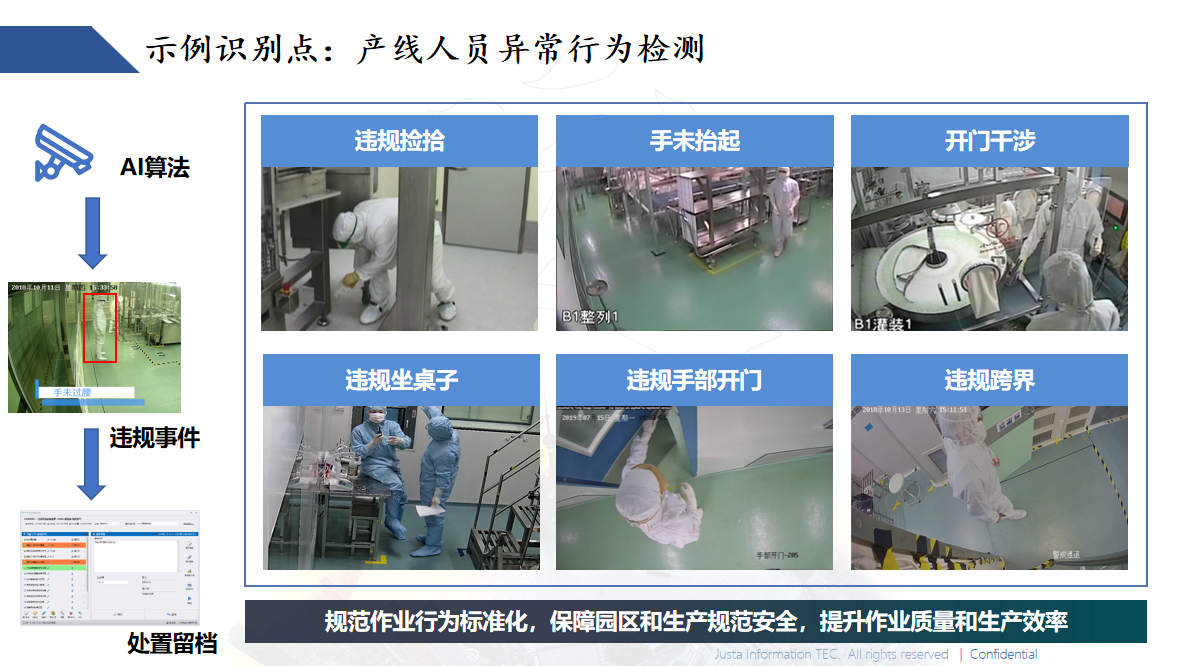 某上市集团生物公司,生产过程对操作规范性与环境安全性要求极高。为实现车间操作智能化管理与安全监控,其提出 AI 识别与视频追溯需求,具体包括穿戴分析(口罩、工服、手套等)、违规弯腰、违规坐桌子等行为检测,并要求针对车间关键与非关键区域采用差异化 AI 识别方案,联动视频追溯与报警上报平台,确保生产过程透明合规。