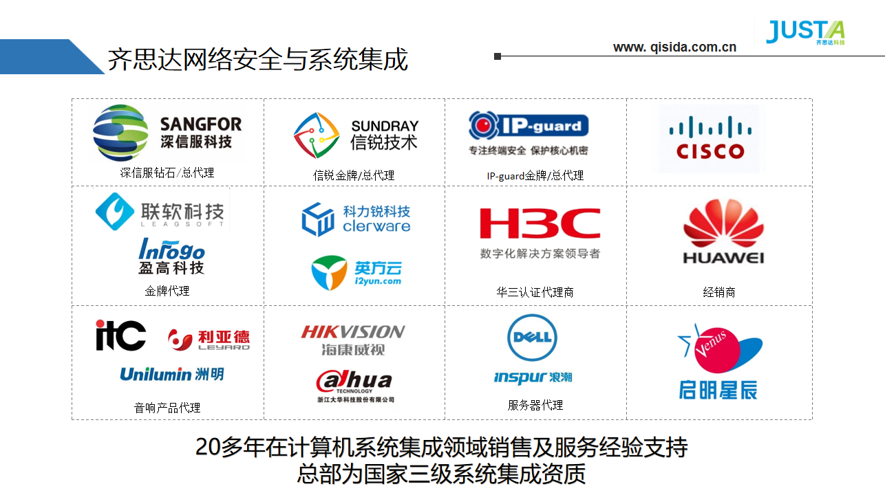 与深信服、信锐、华为、海康威视、IP-guard等知名品牌合作超 10 年,作为省级代理,可全方位整合厂家技术与资源,具备方案设计、实施落地的综合竞争优势。