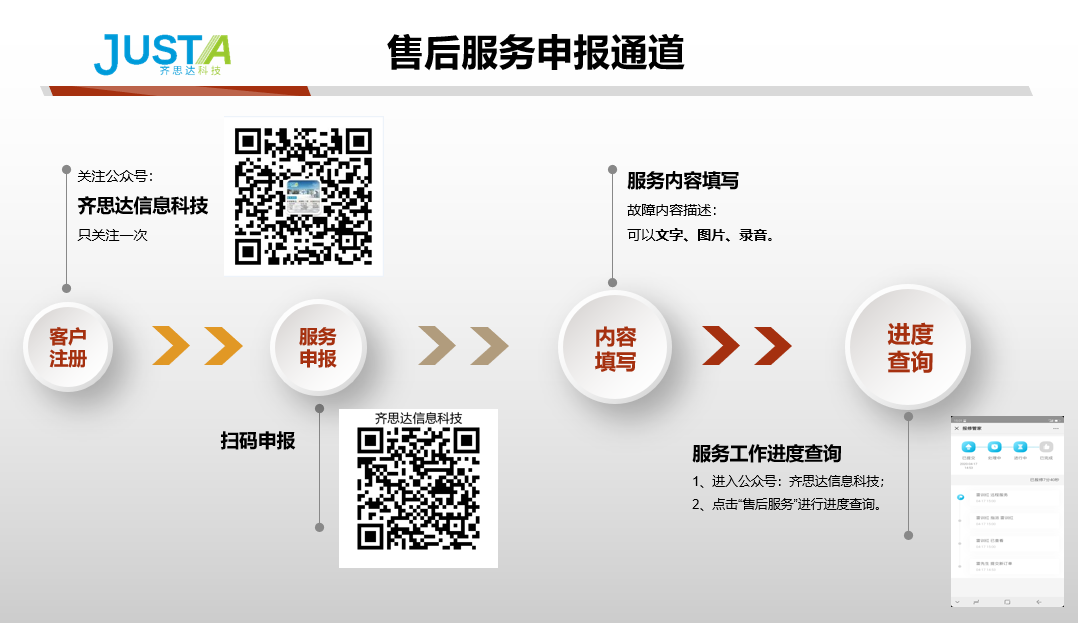 客户可通过公众号、热线电话(180-2597-9272)、邮箱(sw03@gsc18.com)等多渠道申报故障;7×24 小时热线与远程服务快速响应,8:00-18:00 期间 4 小时内、其余时段 6 小时内工程师到达现场,并在到达现场后4 小时内排除故障。如硬件故障在检修8小时后无法解决,则提供一站式厂家对接服务。